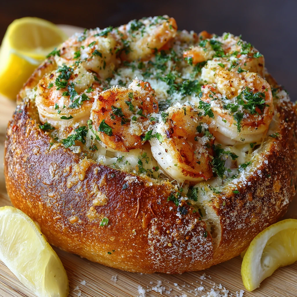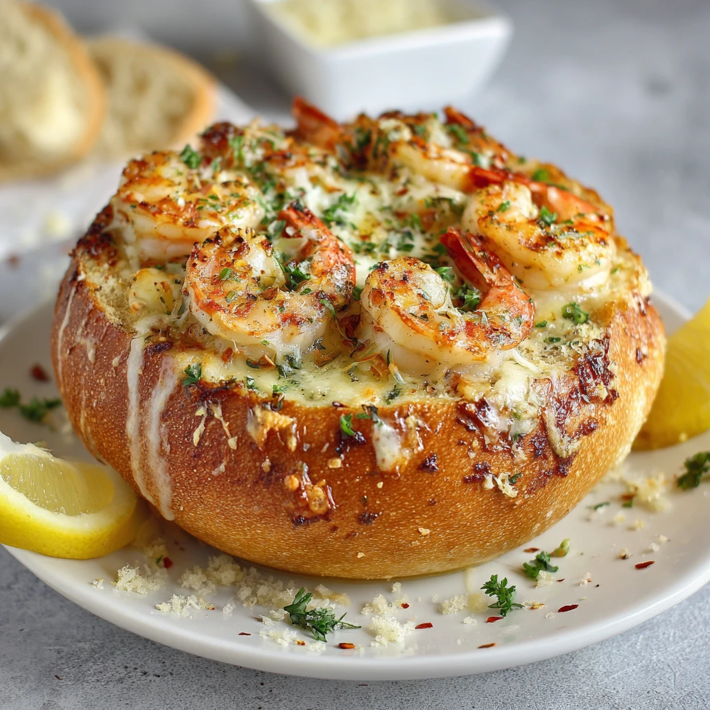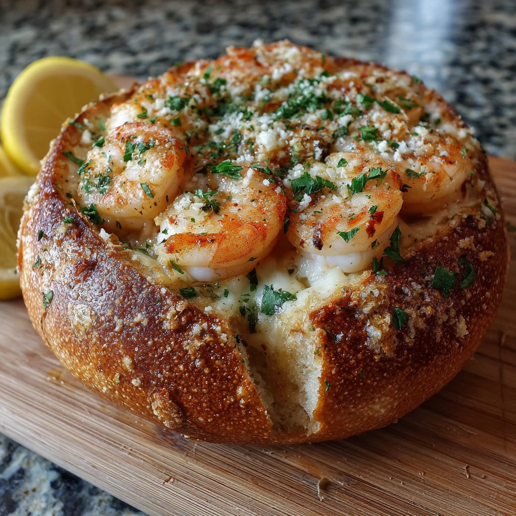 Serve the bread bowl immediately while the cheese is still melted and the shrimp is hot. Lemon wedges are a classic accompaniment to seafood.