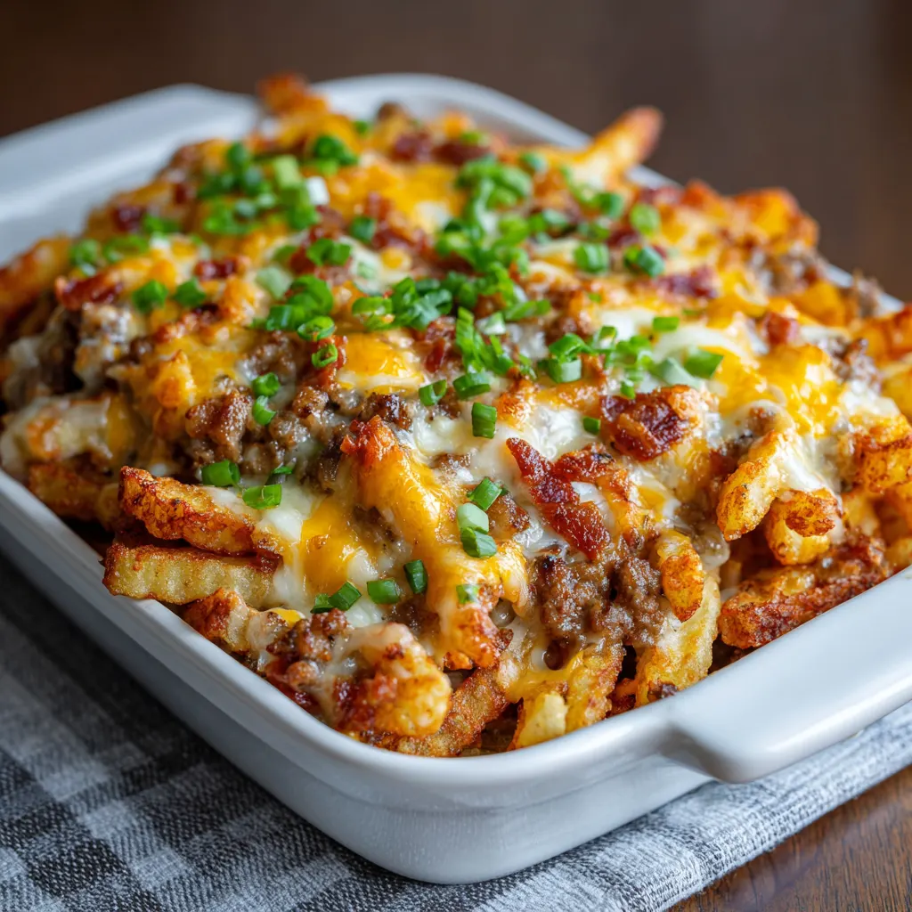 This Cheesy Loaded French Fry Casserole is the ultimate comfort food mashup, combining the crispy satisfaction of golden fries with the indulgent toppings of a fully loaded baked potato. Perfect for game day, a busy weeknight dinner, or a crowd-pleasing potluck side, this dish takes humble frozen fries and transforms them into a decadent masterpiece. By layering crispy potatoes with a rich, velvety cheese sauce, smoky bacon, and fresh aromatics, you create a texture-rich meal that satisfies every craving. It is the kind of dish that disappears minutes after hitting the table, offering a nostalgic yet elevated twist on classic American pub fare.
