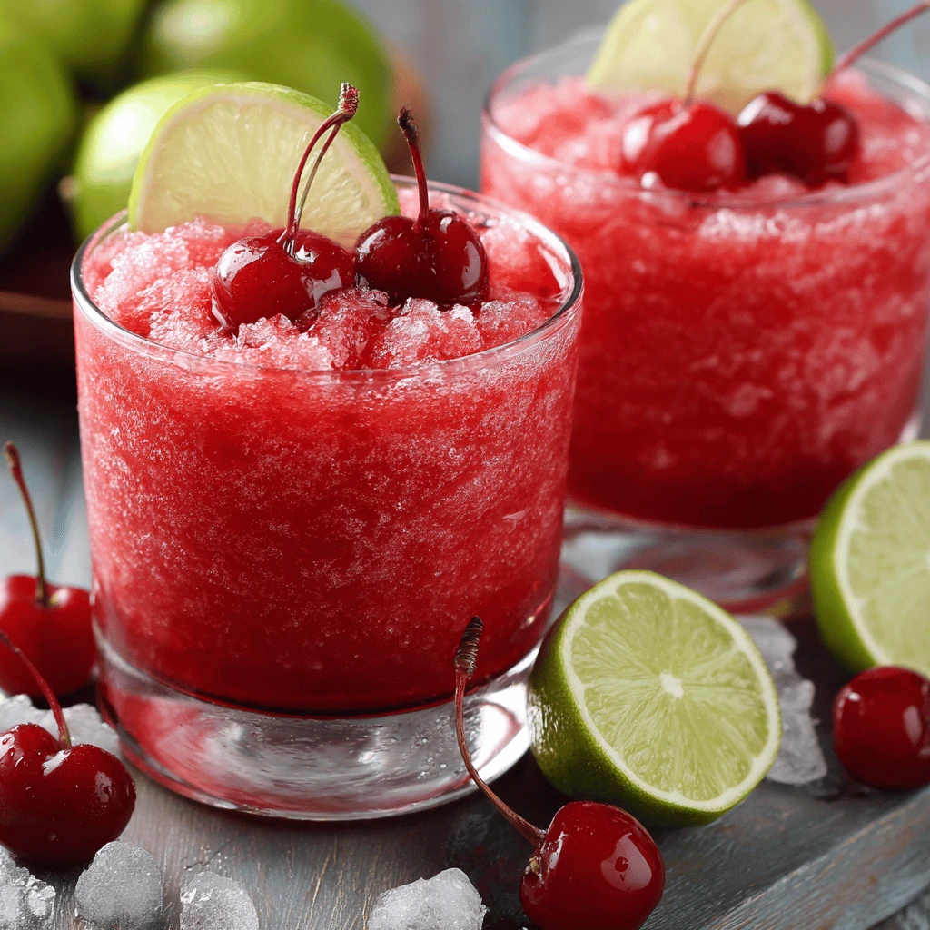 Garnishing elevates the presentation of your cherry limeade slush punch. Lime slices and maraschino cherries are classic choices.