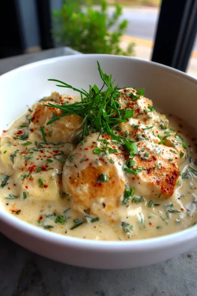 9Pour the sauce over the chicken breasts and sprinkle with chopped fresh dill.