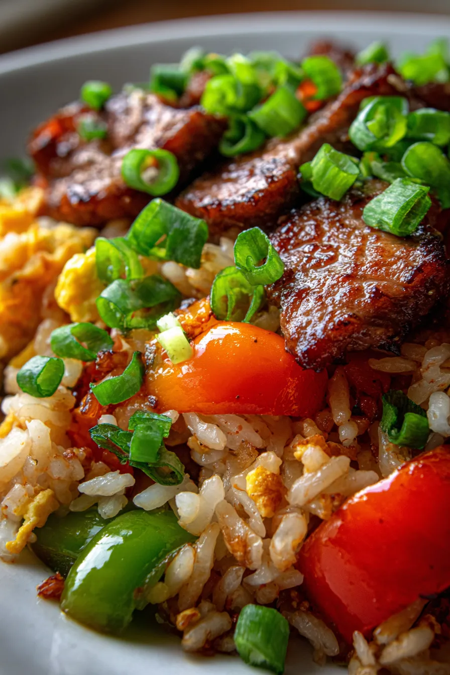 - Step 8 Serve: Remove the Pepper Steak Fried Rice from the heat. Garnish generously with sliced green onions. Serve immediately and enjoy your homemade, restaurant-quality meal!