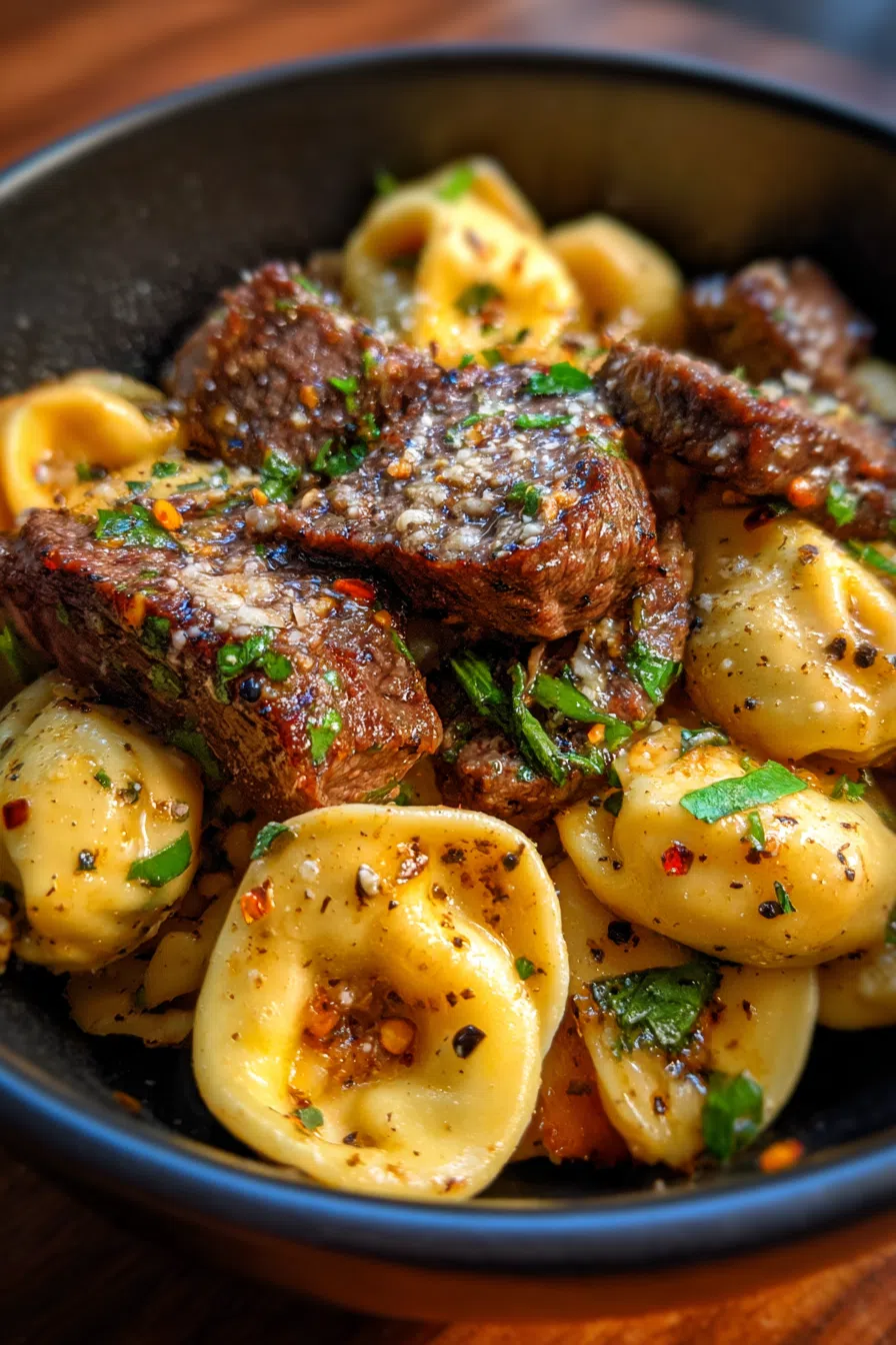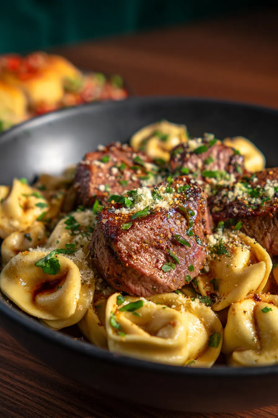 - The perfect harmony of textures – tender steak, al dente tortellini, and creamy garlic butter.
