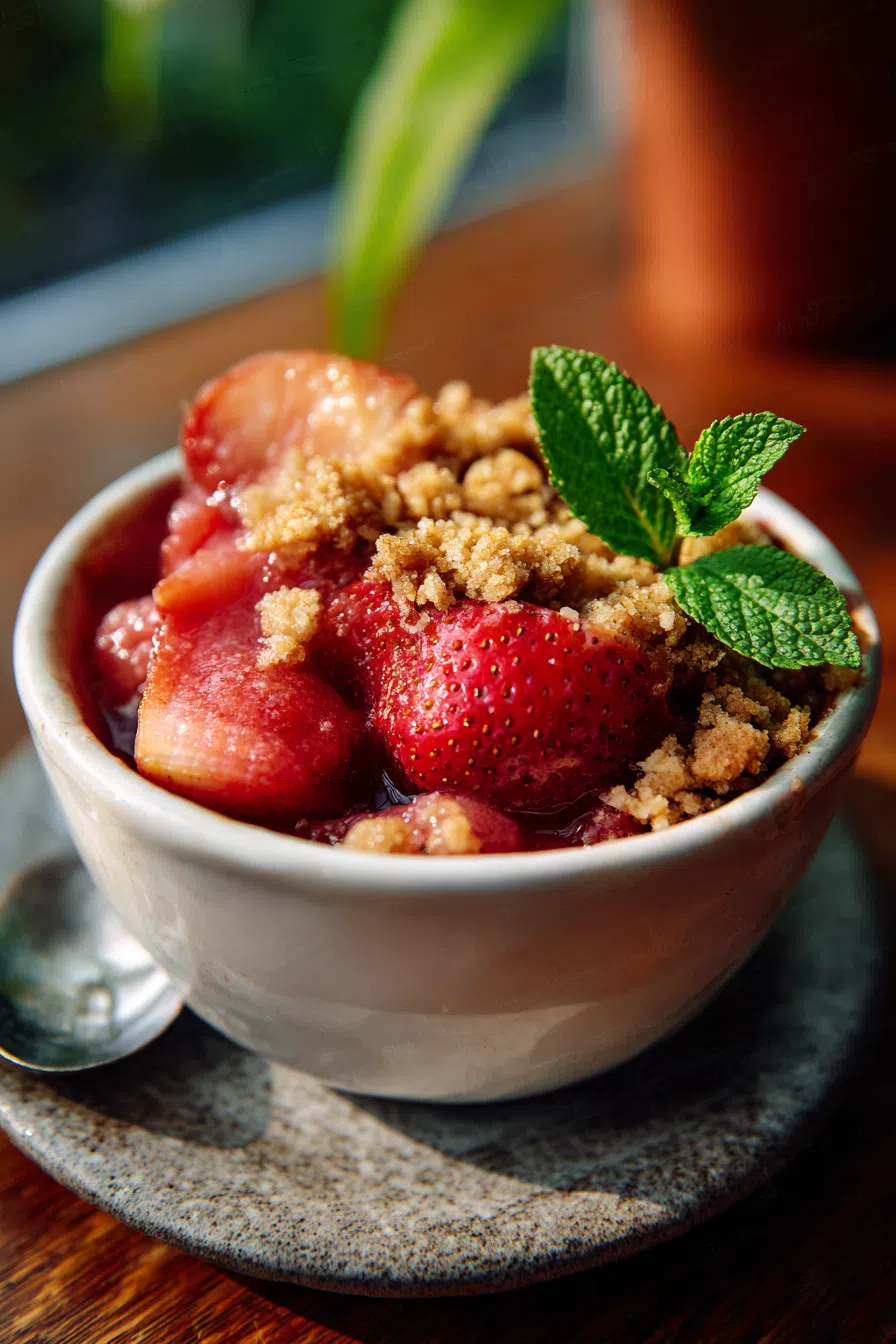 The star ingredients in this recipe are the fresh strawberries and rhubarb, which provide a natural sweetness and tartness that is balanced by the crunch of the almond flour topping.