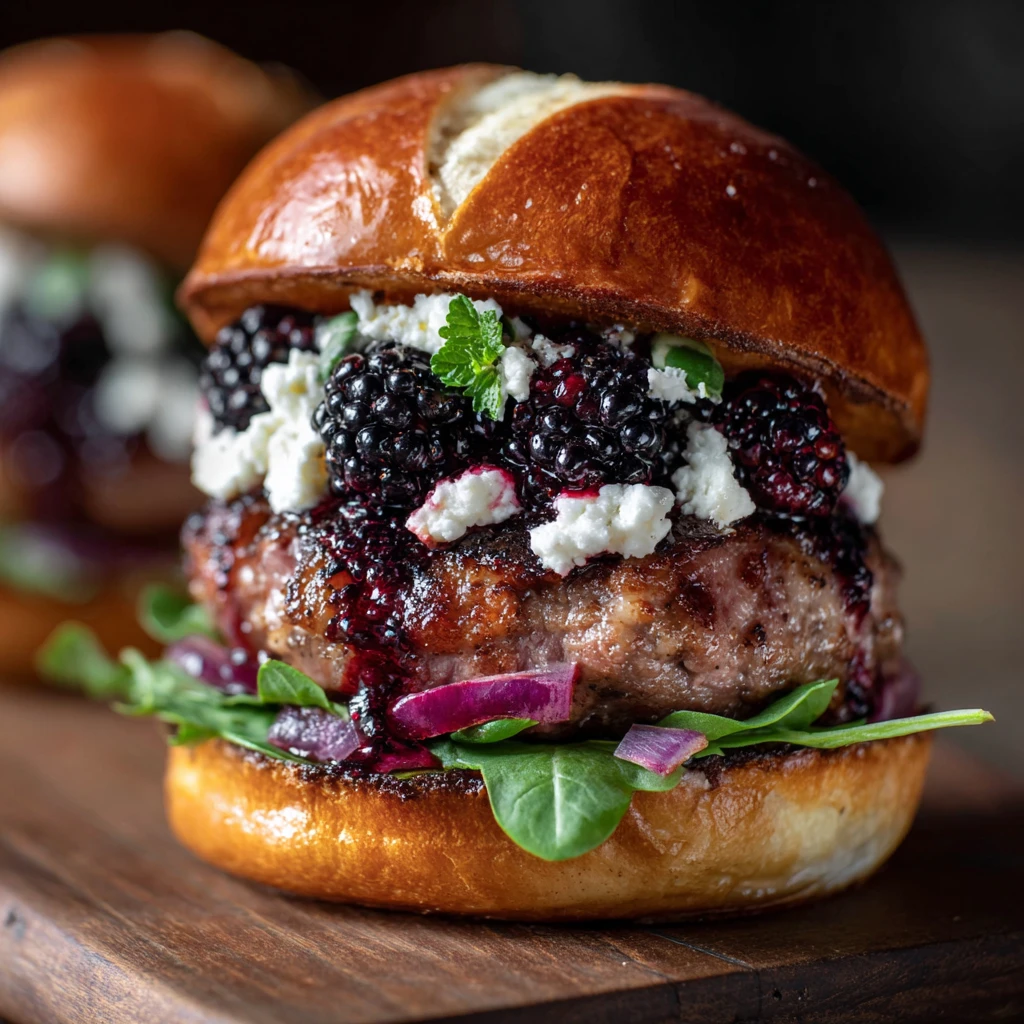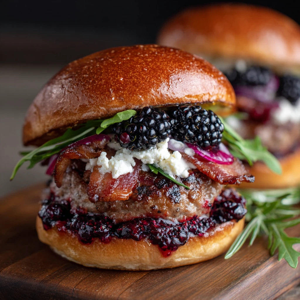 5. Assemble the Burgers: Spread Dijon mustard on the top bun. On the bottom bun, layer the cooked burger patty with melted cheese, caramelized onions, crumbled bacon, fresh blackberries, and a generous spoonful of blackberry preserves or jam. Top with arugula or baby spinach, if desired.