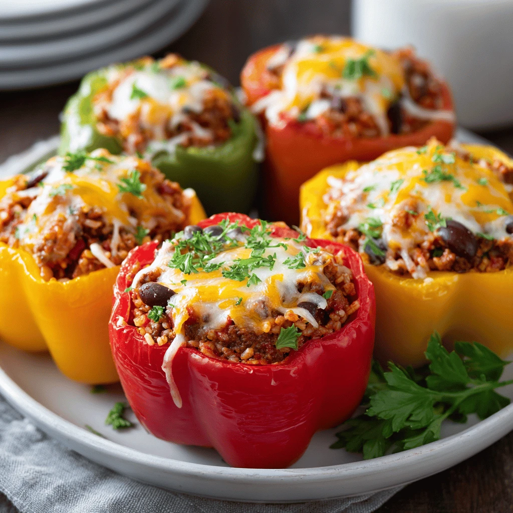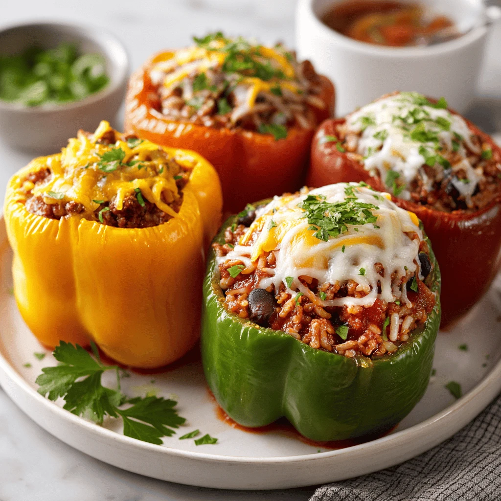 8. Stuff the peppers: Spoon the ground beef mixture into the prepared bell peppers, filling them to the top.