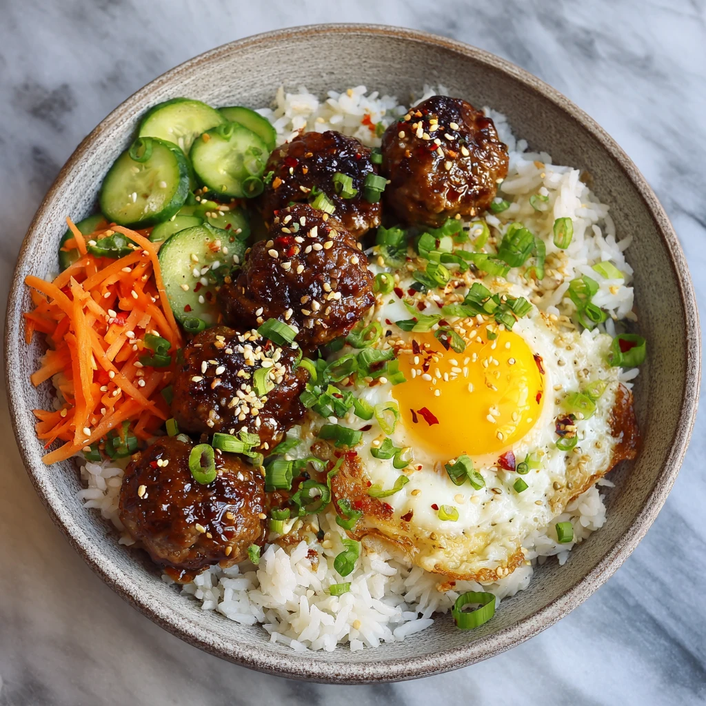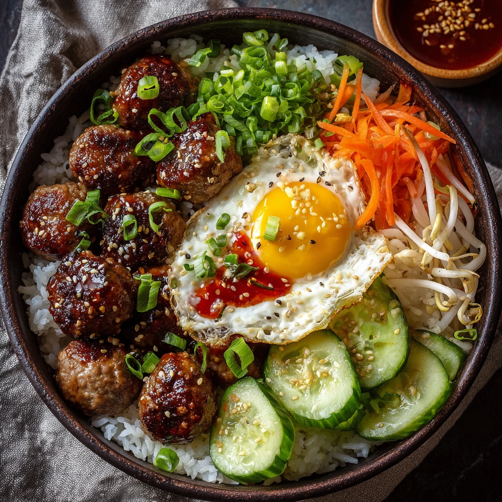 The rice bowl is more than just meatballs and rice; it’s a canvas for adding a variety of flavors and textures.