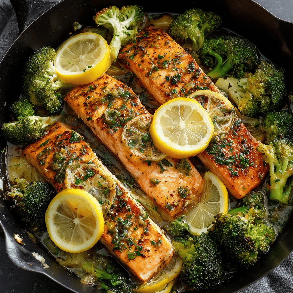 8. Drizzle with sauce: Pour the lemon butter sauce evenly over the salmon fillets and broccoli.