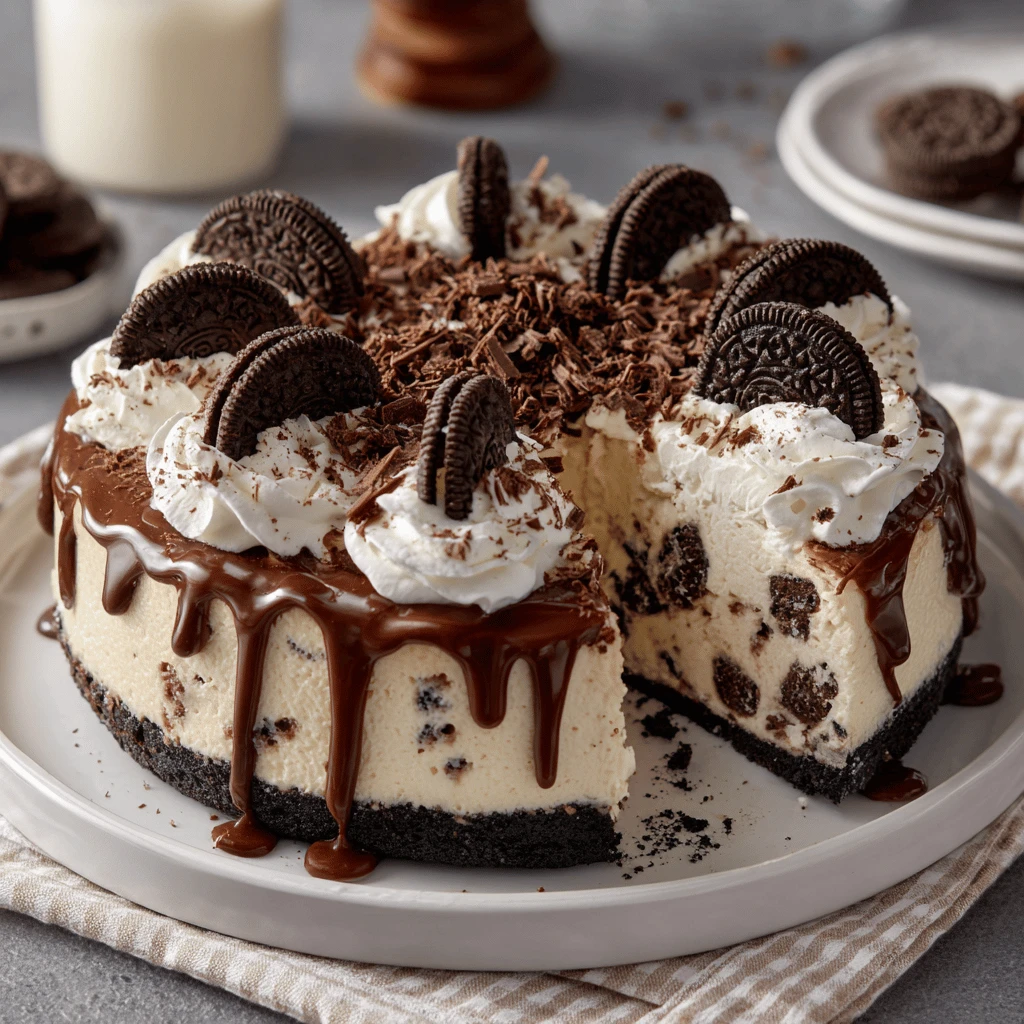 Serve each slice with a dollop of whipped cream. Sprinkle chocolate shavings or chopped Oreos on top. Drizzle with extra hot fudge sauce for a decadent treat.