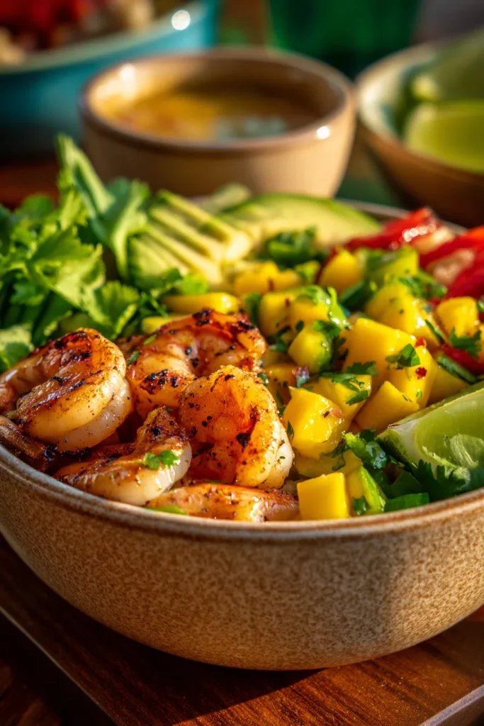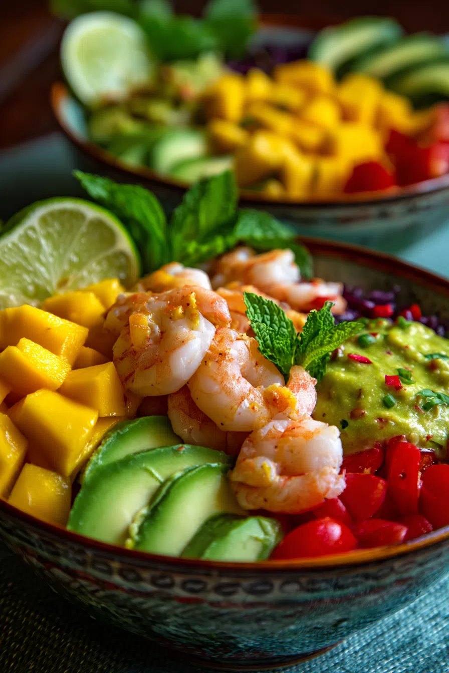 4Assemble the bowls by placing cooked shrimp on the tortillas or bowls, followed by the avocado-mango mixture.