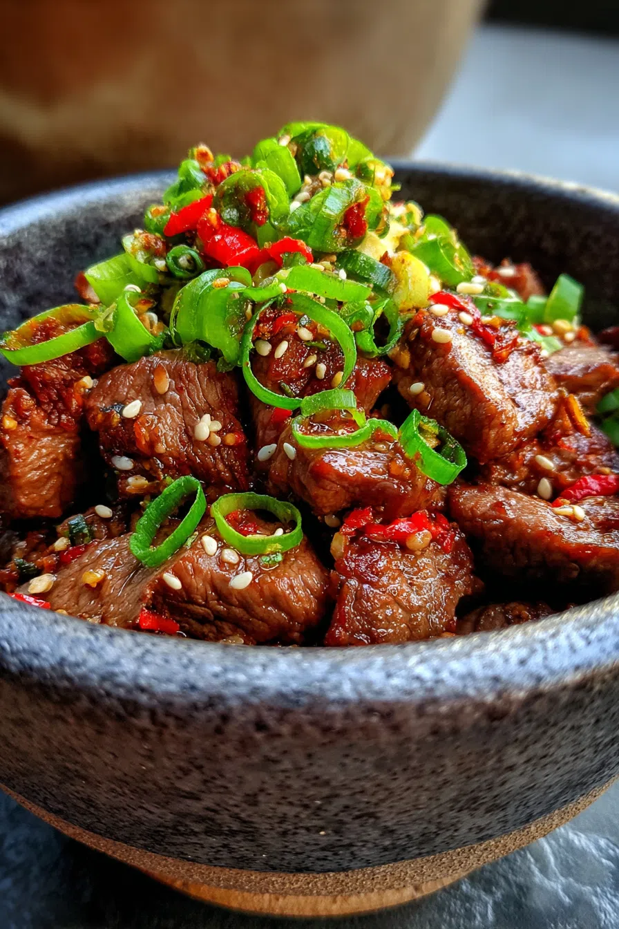 9Serve the beef hot, garnished with green onions and sesame seeds.