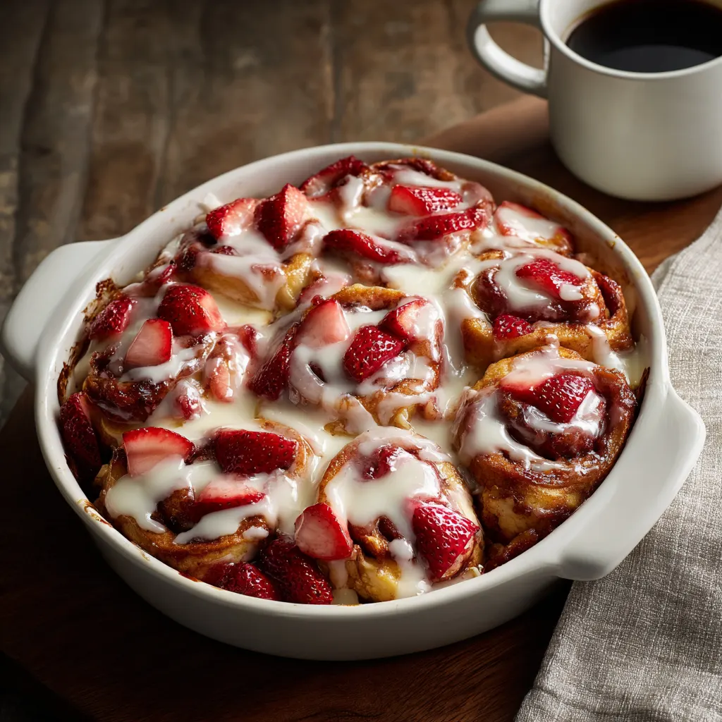 There is something undeniably magical about the aroma of cinnamon and sugar wafting through a kitchen, but when you add the bright, tart burst of fresh strawberries, a classic breakfast becomes an extraordinary treat. This Strawberry Cinnamon Roll Bake is the ultimate “cheat code” for a gourmet brunch; it utilizes the convenience of refrigerated cinnamon roll dough and elevates it into a decadent, bread pudding-style casserole. Whether you are hosting a festive holiday morning, a bridal shower, or simply want to surprise your family on a lazy Sunday, this dish delivers a professional-bakery experience with minimal effort. The contrast between the soft, custard-soaked dough and the juicy, jammy strawberries creates a harmony of textures that makes this recipe a perennial favorite.