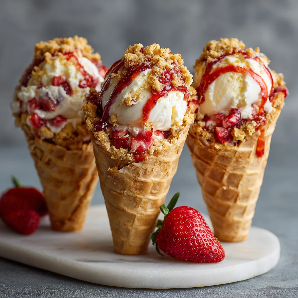 These cones are visually appealing and packed with flavor. The vibrant red strawberries complement the golden crumble. The creamy filling provides a smooth texture, contrasting beautifully with the crispy cone.
