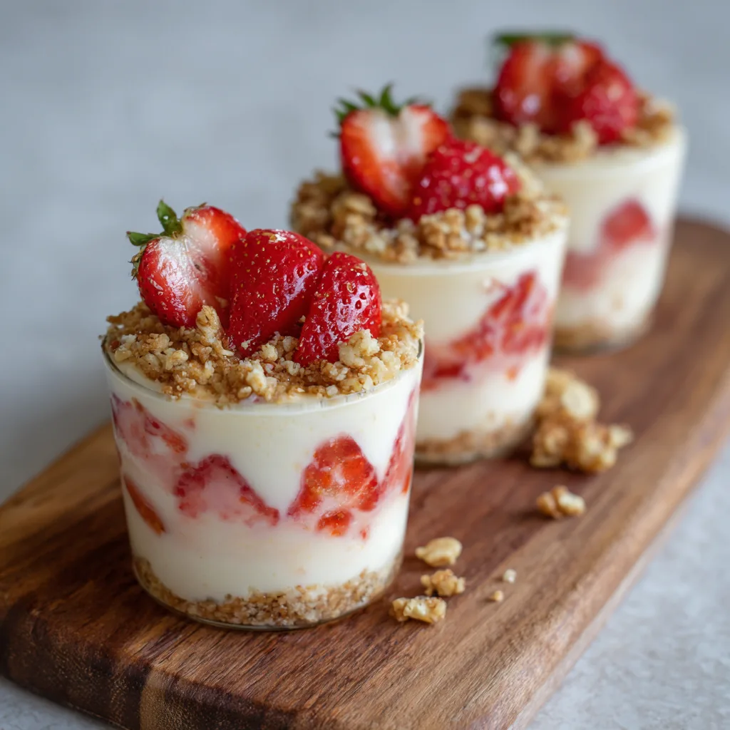 Layer the Cups: Start by placing 2 tablespoons of the strawberry crunch at the bottom of each cup. Add a layer of the creamy pudding mixture, followed by a spoonful of diced fresh strawberries.