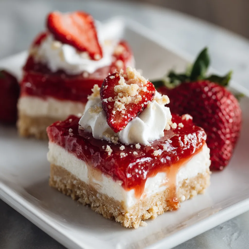 Final Flourish: Before serving, spread the remaining 8 ounces of whipped topping over the strawberry layer. Garnish with fresh strawberry slices or white chocolate shavings. Slice into squares and serve chilled.