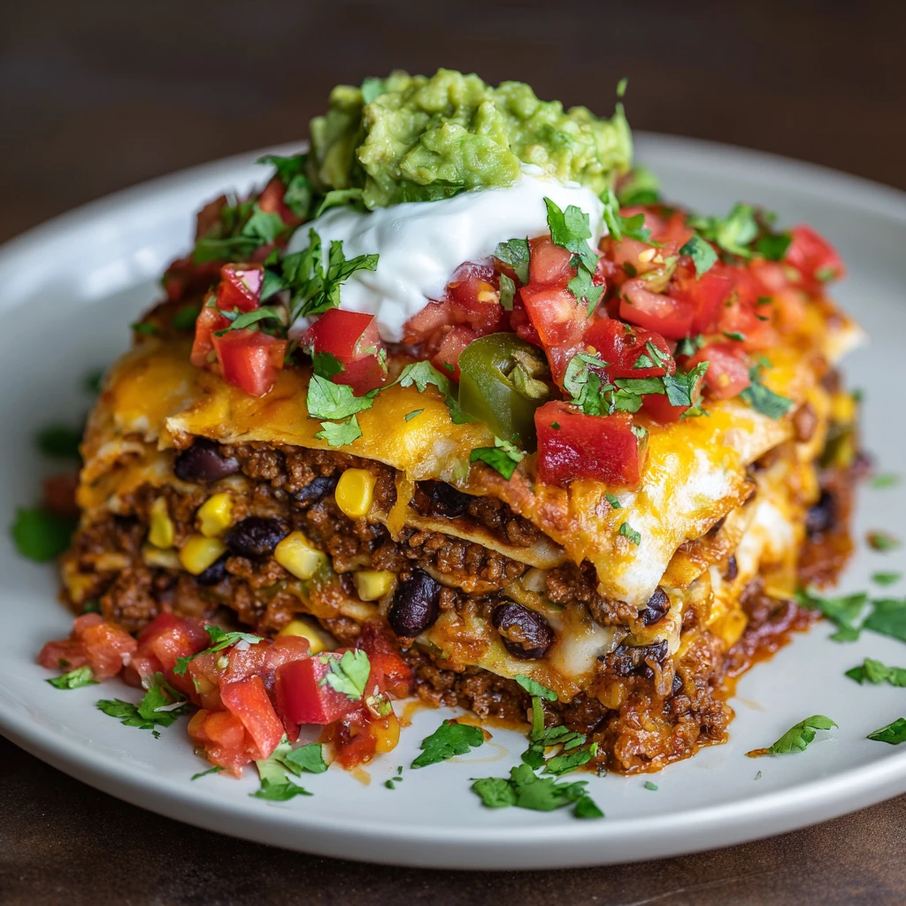 9. Repeat layers of tortilla, ground beef mixture, and cheese until all ingredients are used, ending with a layer of cheese on top. You should have approximately 8 layers.