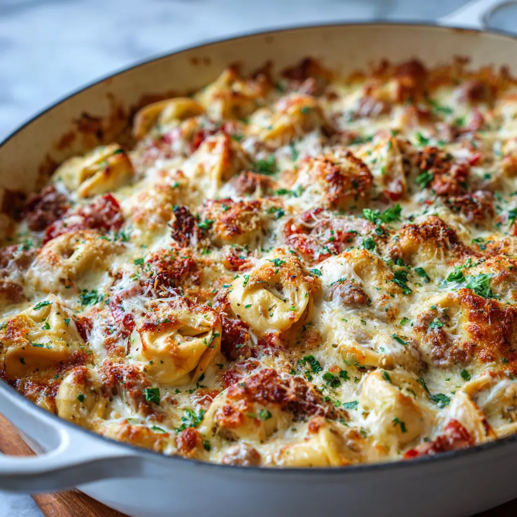The Creamy Tuscan Sausage Tortellini Bake is the ultimate comfort food, blending the bold, savory flavors of central Italy with the convenience of a modern weeknight dinner. This dish elevates refrigerated tortellini into a gourmet experience by pairing it with browned Italian sausage, sun-dried tomatoes, and fresh baby spinach, all smothered in a velvety cream sauce and melted cheese. It is a “one-pan wonder” that feels like it belongs on the menu of a high-end trattoria but can be prepared in under 30 minutes in your own kitchen. Whether you are looking for a cozy family dinner or a crowd-pleasing meal for guests, this recipe offers a perfect balance of protein, pasta, and vibrant vegetables.